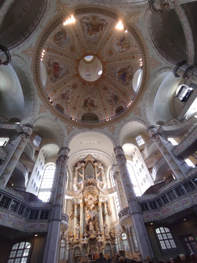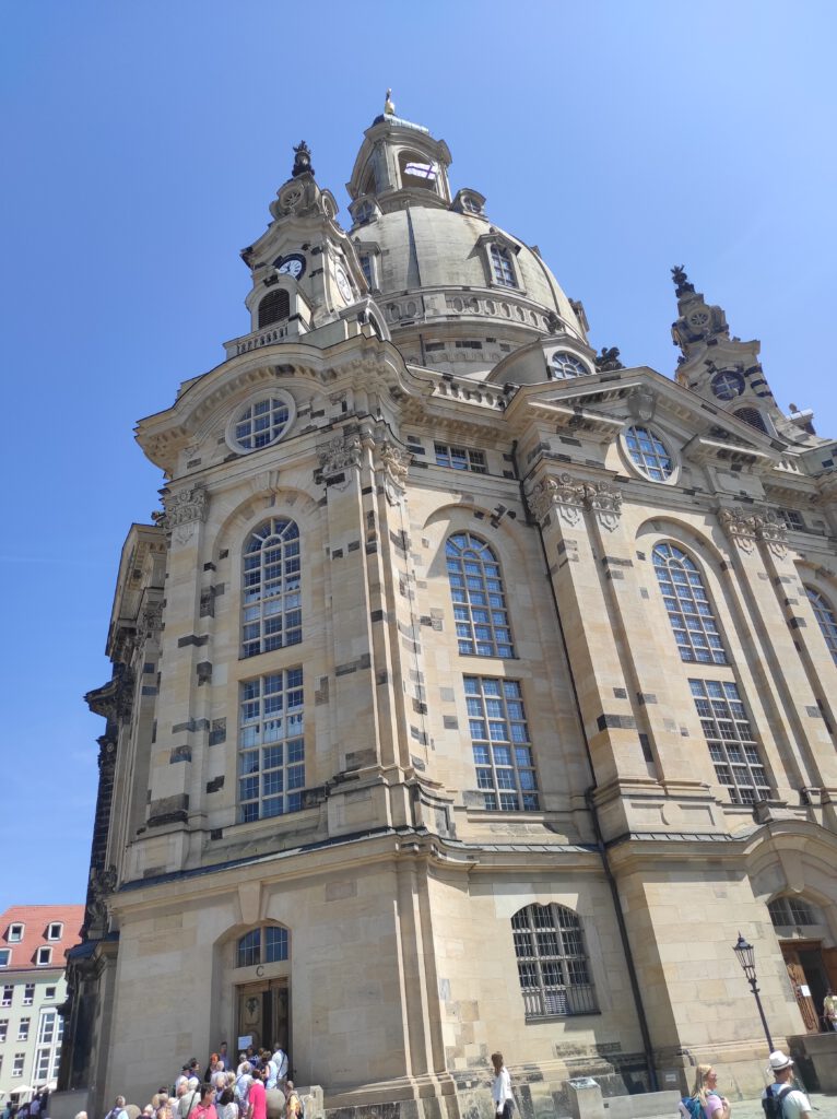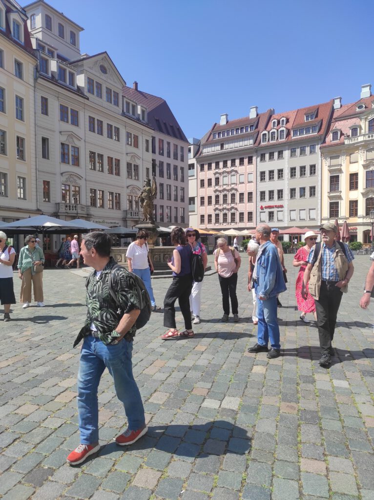 Früh morgens um 7.30 Uhr startete eine kleine Gruppe vom Fehrbelliner Platz nach Dresden. Das Wetter konnte nicht besser sein und  Herr Bertsch vom Busunternehmen Bertsch fuhr uns persönlich mit einem nagelneuen Bus. Die Fahrt verlief ohne große Verzögerungen und wir genossen den Blick und die Gespräche mit den Mitfahrenden. Gegen 10 Uhr trafen wir in Dresden ein und konnten noch ganz entspannt eine Besichtigung der Frauenkirche vor dem Mittagsgottesdienst wahrnehmen. Um 11 Uhr hatte ich eine zweistündige Führung durch die Altstadt gebucht. Pünktlich trafen wir uns mit einer sehr netten Dame, die uns kompetent mit Witz und Charme durch die doch sehr volle Altstadt führte. Nicht alle hatten diese Führung gebucht. Sie sind auf eigene Faust los und hatten natürlich auch viele schöne Eindrücke erfahren. Ganz großes Interesse wurde der nicht mehr vorhandenen Carolabrücke zuteil. Eine wichtige Verbindung von der Altstadt über die Elbe in die Neustadt ist nicht mehr. Aber davon können wir Berliner ja auch ein Lied singen!
